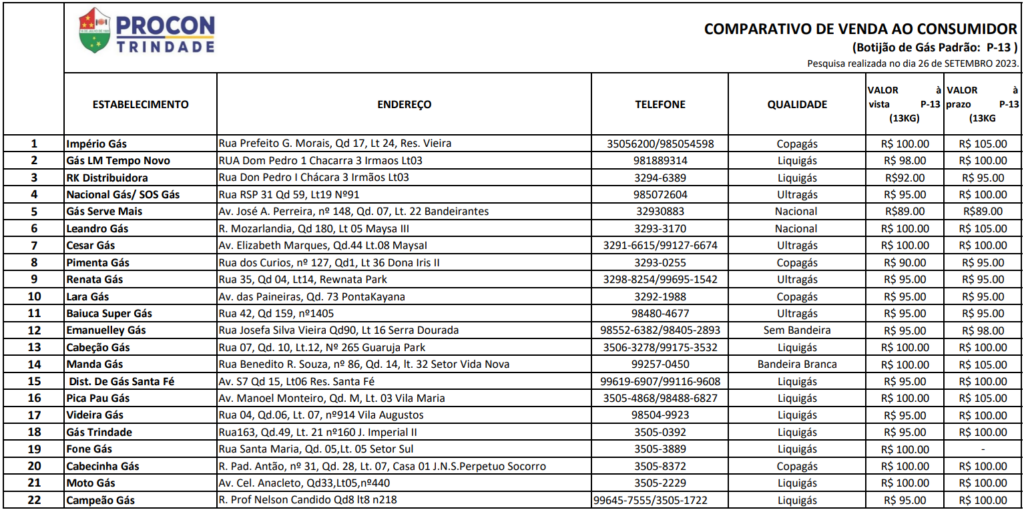O Instituto Municipal de Proteção e Defesa do Consumidor – PROCON Trindade, por meio da Gerência de Fiscalização efetuou, no dia 26 de Setembro de 2023, pesquisa de preço do botijão de gás padrão de cozinha: Botijão de 13 kg para serviço de entrega residencial. Foram pesquisados 22 (vinte e dois) estabelecimentos no Município de Trindade-GO.