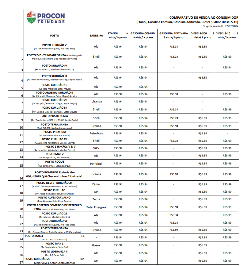 O Instituto Municipal de Proteção e Defesa do Consumidor – PROCON Trindade, por meio da Gerência de Fiscalização efetuou no dia 27 de fevereiro de 2024, pesquisa de preços em 27 (vinte e sete) postos de combustíveis no Município de Trindade-GO.