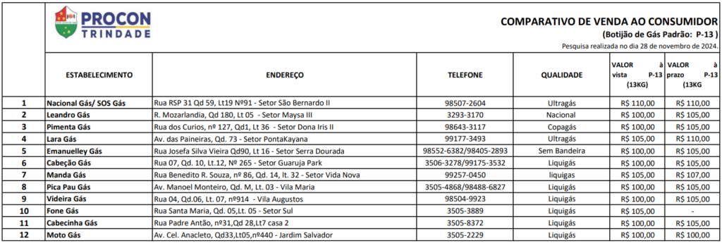 O Instituto Municipal de Proteção e Defesa do Consumidor – PROCON Trindade, por meio da Gerência de Fiscalização efetuou, no dia 28 de novembro de 2024, pesquisa de preço do botijão de gás padrão de cozinha: Botijão de 13 kg para serviço de entrega residencial. Foram pesquisados 12 (doze) estabelecimentos no Município de Trindade-GO.