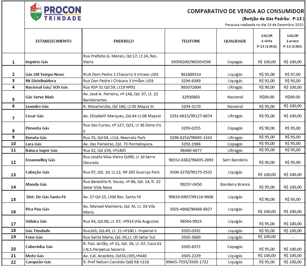 O Instituto Municipal de Proteção e Defesa do Consumidor – PROCON Trindade, por meio da Gerência de Fiscalização efetuou, no dia 20 de dezembro de 2023, pesquisa de preço do botijão de gás padrão de cozinha: Botijão de 13 kg para serviço de entrega residencial. Foram pesquisados 22 (vinte e dois) estabelecimentos no Município de Trindade-GO.