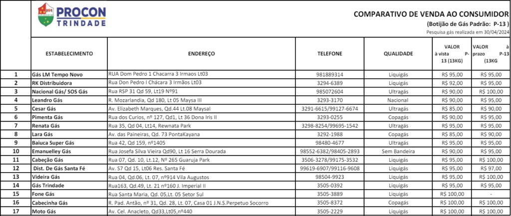 O Instituto Municipal de Proteção e Defesa do Consumidor – PROCON Trindade, por meio da Gerência de Fiscalização efetuou, no dia 30 de abril de 2024, pesquisa de preço do botijão de gás padrão de cozinha: Botijão de 13 kg para serviço de entrega residencial. Foram pesquisados 17 (dezessete) estabelecimentos no Município de Trindade-GO.